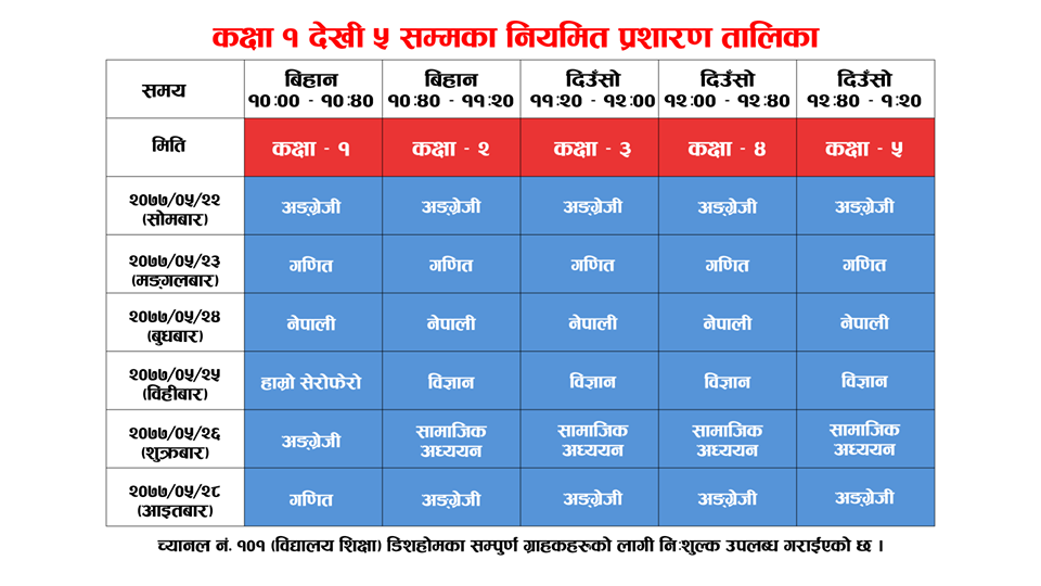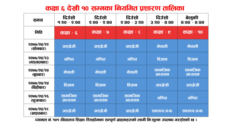 शिक्षा विज्ञान तथा प्रविधि मन्त्रालय, शिक्षा तथा मानव स्रोत विकास केन्द्रबाट उत्पादन गरिएका कक्षा १ देखी १० सम्मका विषयगत पाठहरु मिति २०७७ भाद्र २२ गते देखी तल दिइएको तालिका अनुसार डिशहोम च्यानल नं १०१ मा प्रशारण भइरहेको छ ।